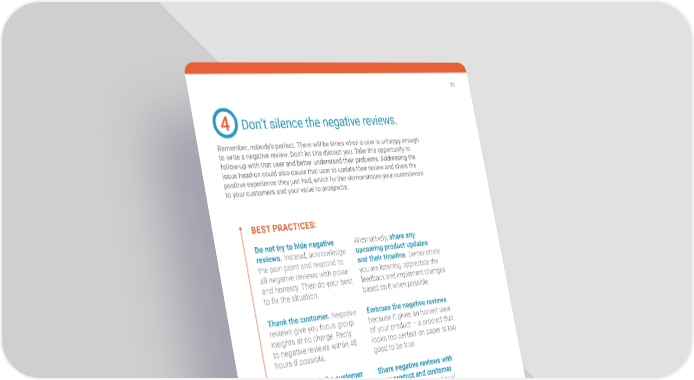 23 4 Don’t silence the negative reviews . Remember, nobody’s perfect . There will be times when a user is unhappy enough to write a negative review . Don’t let this distract you . Take this opportunity to follow-up with that user and better understand their problems . Addressing the issue head-on could also cause that user to update their review and share the positive experience they just had, which further demonstrates your commitment to your customers and your value to prospects . BEST PRACTICES: Do not try to hide negative Alternatively, share any reviews. Instead, acknowledge upcoming product updates the pain point and respond to and their timeline. Demonstrate all negative reviews with poise you are listening, appreciate the and honesty. Then do your best feedback and implement changes to fix the situation. based on it when possible. Thank the customer. Negative Embrace the negative reviews reviews give you focus group because it gives an honest view insights at no charge. Reply of your product — a product that to negative reviews within 48 looks too perfect on paper is too hours if possible. good to be true. Follow up with the customer Share negative reviews with to make sure their issue has your product and customer been addressed. success teams for continual improvement. When possible, share recent product updates that may reverse the negative review. Show you are dedicated to making the product better and more user friendly for everyone. 2 CROWD
