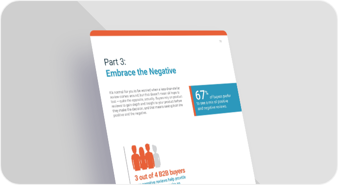 10 Part 3: Embrace the Negative It’s normal for you to be worried when a less-than-stellar review comes around, but that doesn’t mean all hope is % lost — quite the opposite, actually. Buyers rely on product 67 of buyers prefer reviews to gain depth and insight to your product before they make the decision, and that means seeing both the to see a mix of positive positive and the negative . and negative reviews . 3 out of 4 B2B buyers say negative reviews help provide a depth of insight to make an informed decision. 2 CROWD