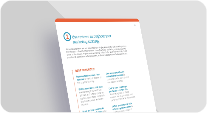 21 2 Use reviews throughout your marketing strategy . As we saw, reviews are not restricted to a single phase of the B2B buyer’s journey; therefore you should utilize reviews throughout your marketing strategy at every stage of the funnel . A good review strategy helps foster trust and credibility, build your brand, establish market presence, and reinforce a prospect’s decision to buy . BEST PRACTICES: Develop testimonials from Use reviews to identify reviews at various stages of potential references for the buyer’s journey. customers who have similar use-case scenarios. Utilize reviews as call-outs in early-stage content like Link to your company’s eBooks and whitepapers as profile on a review site. well as later-stage materials Refer prospects to these like testimonials and case reviews for an unbiased, third studies. party testimonial to close sales. Draw on your reviews to Utilize products and data uncover the solutions your offered by review sites to product addresses and build display testimonials and new messaging from them for competitive insights. early-stage communications. Work with your customer support team to identify users and reviews that can be featured in sales and marketing collateral. 2 CROWD