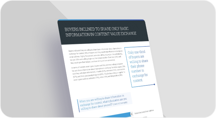 BUYERS INCLINED TO SHARE ONLY BASIC INFORMATION IN CONTENT VALUE EXCHANGE Buyers indicated they are willing to share basic information about themselves in exchange for content; 95% of buyers said they would share their name/company/ Only one-third email address. Eighty-five percent were also willing to give job title and industry, but just 33% were willing to give up their phone number. Even less (18%) said of buyers are they would give their budget, purchase timing and annual revenue. In terms of content asset types, buyers said they are most willing to register willing to share for and share information about themselves in exchange for white papers (76% their phone said they will share information), E-books (63%), webinars (79%), case studies (57%) and third-party/analyst reports (66%). They’re less willing to register for number in asset types such as podcasts (19%), video (19%) and infographics (24%). exchange for content. When you are willing to share information in exchange for content, what information are you (Check all that apply) willing to share about yourself? 95% Name/Company/Email Address 33% Telephone number 85% Job title/Industry 18% Budget/Purchase Timing/Annual Revenue 4% Other (please specify) 2017 Content Preferences Survey Report • 10