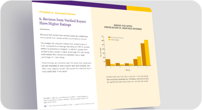 \ Prompted vs. Unprompted Reviews 1. Reviews from Verified Buyers AVERAGE STAR RATING: Have Higher Ratings VERIFIED BUYERS VS. ANONYMOUS REVIEWERS We found that reviews from verified buyers are substantially 70 Anonymous Consumer more positive than reviews written by anonymous sources. 60 Verified Buyer The average star rating for reviews from verified buyers is 50 4.34, compared to an average star rating of 3.89 for reviews e written by anonymous reviewers. In addition, reviews from g 40 a t verified buyers contain a higher percentage of 5-star ratings, n rce30 while reviews from anonymous reviewers have a larger e percentage of 1-star ratings. P 20 These findings are consistent with the theory that people who 10 are self-motivated to write a review have more extreme, and often more negative reviews. We explore this selection bias in 0 1 2 3 4 5 more detail later in the report. Rating Verified buyers are more likely to give four- or five-star ratings than anonymous reviewers are. Conversely, anonymous buyers are significantly more likely to give one- and two-star reviews. Askalidis, Y., Kim, S.J., and Malthouse E.C. (2017), “Understanding and Overcoming Biases in Customer Reviews.” Decision Support Systems. 97 (May 2017), 23-30. 14 \ How Online Reviews Influence Sales \ spiegel.medill.northwestern.edu