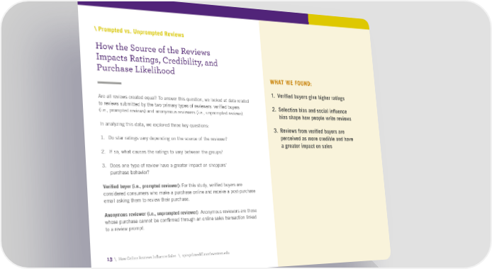 \ Prompted vs. Unprompted Reviews How the Source of the Reviews Impacts Ratings, Credibility, and Purchase Likelihood WHAT WE FOUND: 1. Verified buyers give higher ratings Are all reviews created equal? To answer this question, we looked at data related to reviews submitted by the two primary types of reviewers: verified buyers 2. Selection bias and social influence (i.e., prompted reviews) and anonymous reviewers (i.e., unprompted reviews). bias shape how people write reviews In analyzing this data, we explored three key questions: 3. Reviews from verified buyers are 1. Do star ratings vary depending on the source of the reviewer? perceived as more credible and have a greater impact on sales 2. If so, what causes the ratings to vary between the groups? 3. Does one type of review have a greater impact on shoppers’ purchase behavior? Verified buyer (i.e., prompted reviewer): For this study, verified buyers are considered consumers who make a purchase online and receive a post-purchase email asking them to review their purchase. Anonymous reviewer (i.e., unprompted reviewer): Anonymous reviewers are those whose purchase cannot be confirmed through an online sales transaction linked to a review prompt. 13 \ How Online Reviews Influence Sales \ spiegel.medill.northwestern.edu