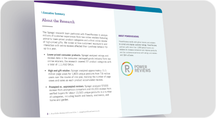 \ Executive Summary About the Research The Spiegel research team partnered with PowerReviews to analyze ABOUT POWER REVIEWS millions of customer experiences from two online retailers featuring primarily lower-priced product categories and a third online retailer PowerReviews works with global brands and retailers of high-priced gifts. We looked at how customers’ exposure to and to collect and display customer ratings. PowerReviews interaction with online reviews affected their purchase behavior for partners with more than 1,000 global brands and up to a year. retailers to increase conversion and improve products and the customer experience with ratings and reviews • Lower-priced consumer products: Spiegel analyzed ratings and and Q&A software. reviews data in the consumer packaged goods industry from two online retailers; the research covered 22 product categories with a total of 111,460 SKUs. • High-end gift retailer: Spiegel analyzed approximately 15.5 million page views for 1,800 unique products from 7.8 million users over the course of one year, tracking the number of page views and sales as each product accumulated reviews. • Prompted vs. unprompted reviews: Spiegel analyzed 57,000 reviews from anonymous consumers and 65,000 reviews from verified buyers for about 13,500 unique products in a number of categories, including health and beauty, electronics, and home and garden. 3 \ How Online Reviews Influence Sales \ spiegel.medill.northwestern.edu