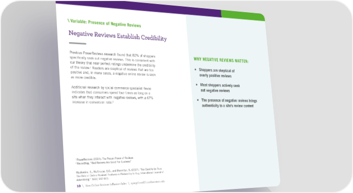 \ Variable: Presence of Negative Reviews Negative Reviews Establish Credibility Previous PowerReviews research found that 82% of shoppers WHY NEGATIVE REVIEWS MATTER: specifically seek out negative reviews. This is consistent with our theory that near-perfect ratings undermine the credibility • Shoppers are skeptical of 1 Readers are skeptical of reviews that are too of the review. overly positive reviews positive and, in many cases, a negative online review is seen as more credible. • Most shoppers actively seek Additional research by social commerce specialist Revoo out negative reviews indicates that consumers spend four times as long on a site when they interact with negative reviews, with a 67% • The presence of negative reviews brings increase in conversion rate.2 authenticity to a site’s review content 1 PowerReviews (2014): The Proven Power of Reviews 2 RevooBlog, “Bad Reviews Are Good For Business” Maslowska, E., Malthouse, E.C., and Bernritter, S. (2017), “Too Good to be True: The Role of Online Reviews’ Features in Probability to Buy, International Journal of Advertising.” 36(1) 142-163. 10 \ How Online Reviews Influence Sales \ spiegel.medill.northwestern.edu