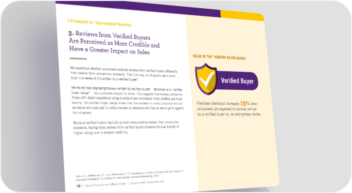 \ Prompted vs. Unprompted Reviews 3. Reviews from Verified Buyers Are Perceived as More Credible and Have a Greater Impact on Sales VALUE OF THE “VERIFIED BUYER BADGE” We examined whether consumers evaluate reviews from verified buyers differently than reviews from anonymous reviewers. That is to say, do shoppers place more Verified Buyer trust in a review if it’s written by a verified buyer? We found that displaying reviews written by verified buyers – identified by a “verified buyer badge” – has a positive impact on sales. This suggests that reviews written by those with direct experience using a product are considered more credible and trust- Purchase likelihood increases 15% when worthy. The verified buyer badge shows that the reviewer is a real consumer and not someone who was paid to write a review or someone who has an axe to grind against consumers are exposed to reviews written the company. by a verified buyer vs. an anonymous review. Because verified buyers typically provide more positive reviews than anonymous reviewers, having more reviews from verified buyers provides the dual benefit of higher ratings and increased credibility. Kim, S.J., Malthouse, E.C., and Maslowska, E. “Understanding the Role of Different Review Features in Purchase Probability” Submitted to International Journal of Advertising, 2017. 16 \ How Online Reviews Influence Sales \ spiegel.medill.northwestern.edu
